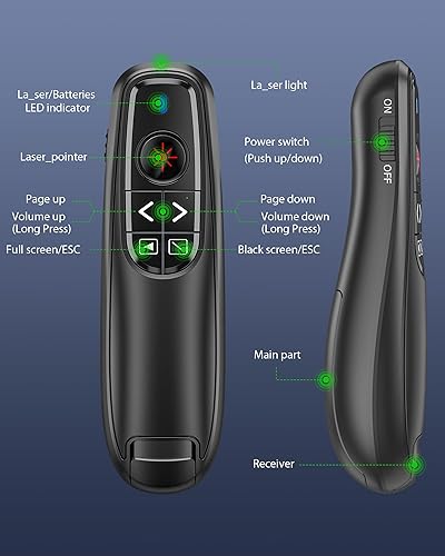 INTUITIVE PRESENTATION POINTER WITH VOLUME CONTROL: This classic presentation remote meets the classic demands of red pointer,page up,page down,full screen,black screen and volume control. This power point remote clicker help you gain more confidence in your teaching,coaching,speeching,meeting or conference presentations, and this laser pointer for presentation also works as a cat chase toy to entertain your pets with the bright red light
