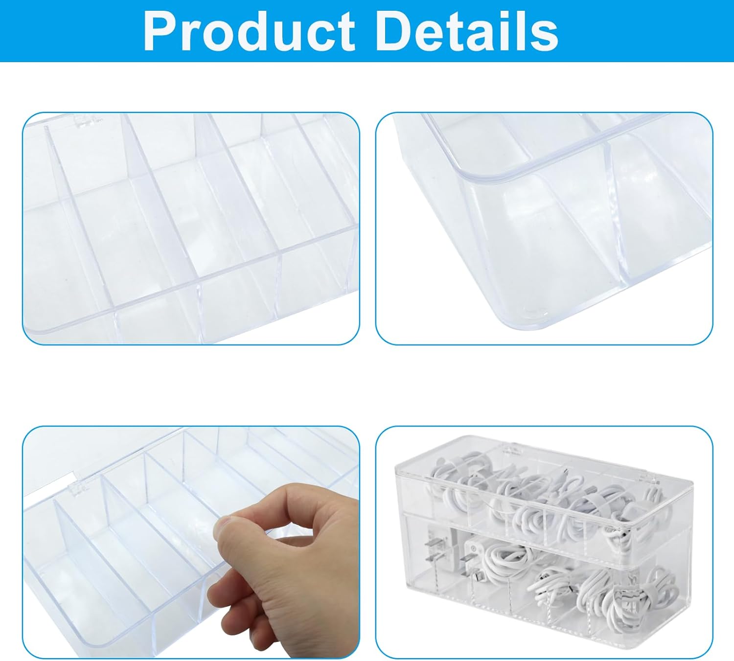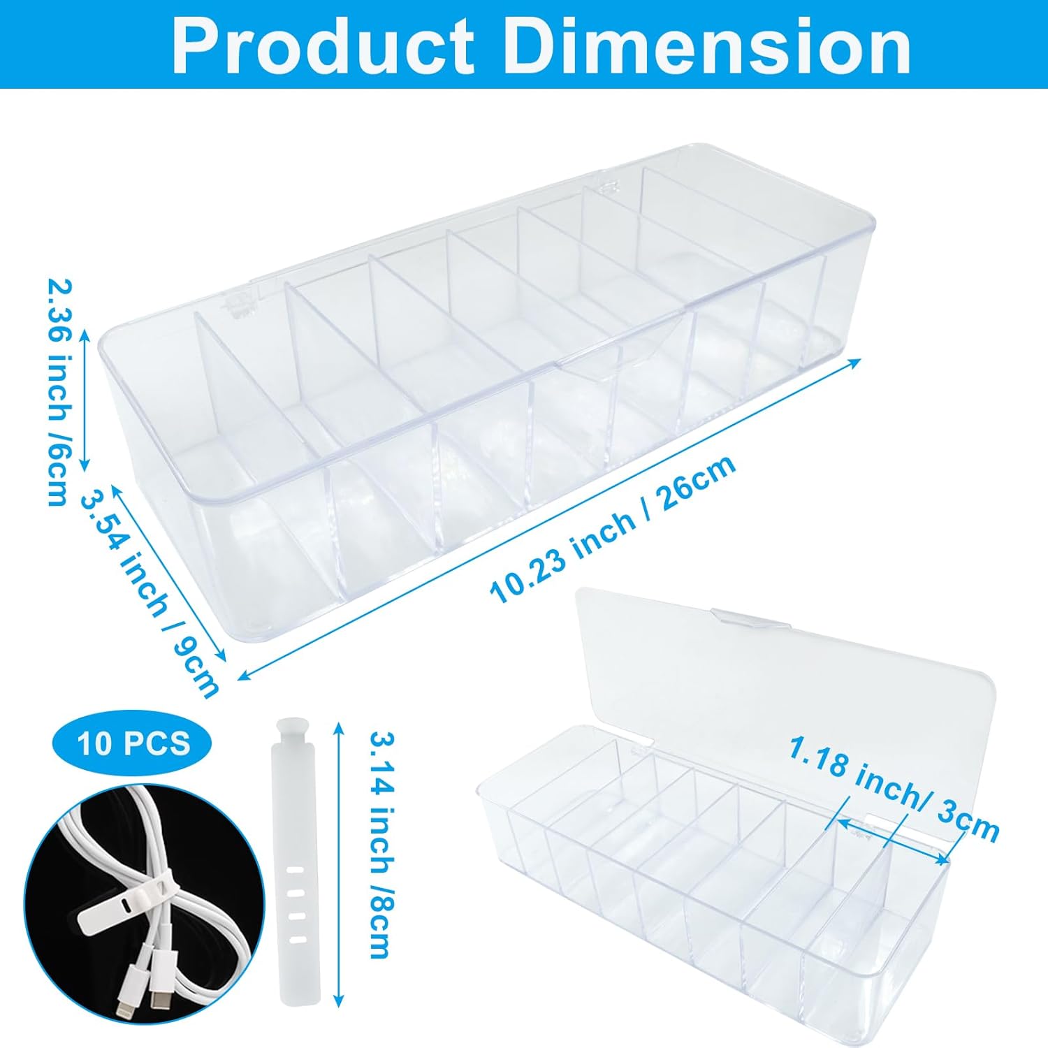 Transparent Storage Boxes with Silica Gel Ties:2 Pack cable organizer includes 2 clear boxes (10.23x3.54x2.36 inches) and 20 silicone ties. Constructed from thickened waterproof plastic, the transparent design ensures visibility while protecting cables, chargers, cosmetics, or jewelry from dust and moisture.