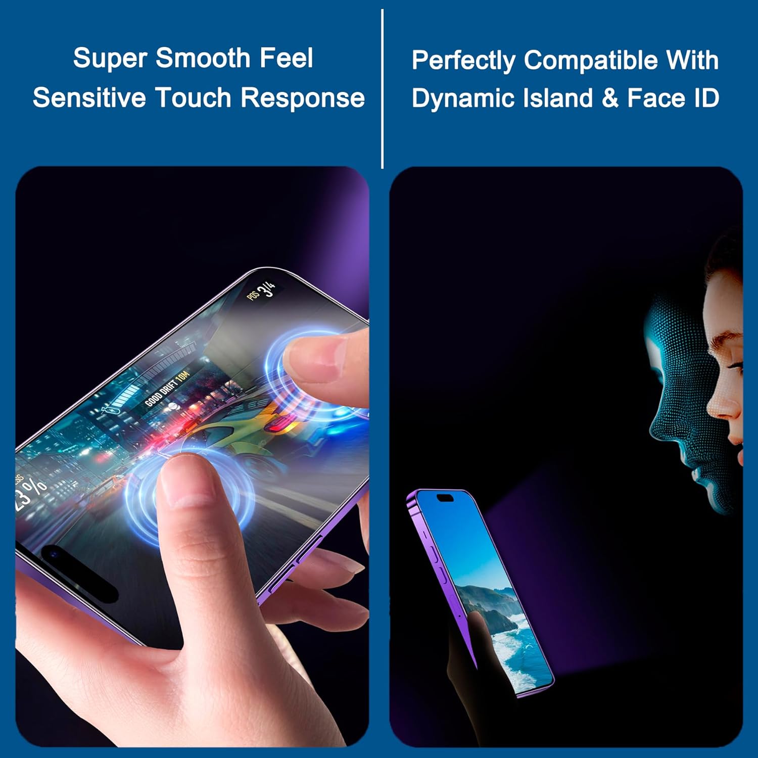 PERFECTLY COMPATIBLE WITH iPhone DYNAMIC ISLAND & FACE ID: Perfectly compatible with all sensors located in the dynamic island area, to make your Face ID and front camera work well and sensitively like there's no screen protector.