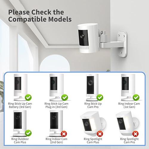 Compatible Camera Models: Wall mount is compatible with the following models: Ring Stick Up Cam Battery, Ring Stick Up Cam Plug-in, Ring Stick Up Cam Pro, Ring Indoor Cam (1st Gen), and Ring Outdoor Cam Plus. It is also suitable for other security cameras equipped with a 1/4-inch threaded interface, such as Arlo cameras and Wyze panoramic cameras. Not for Ring Indoor Cam (2nd Gen).