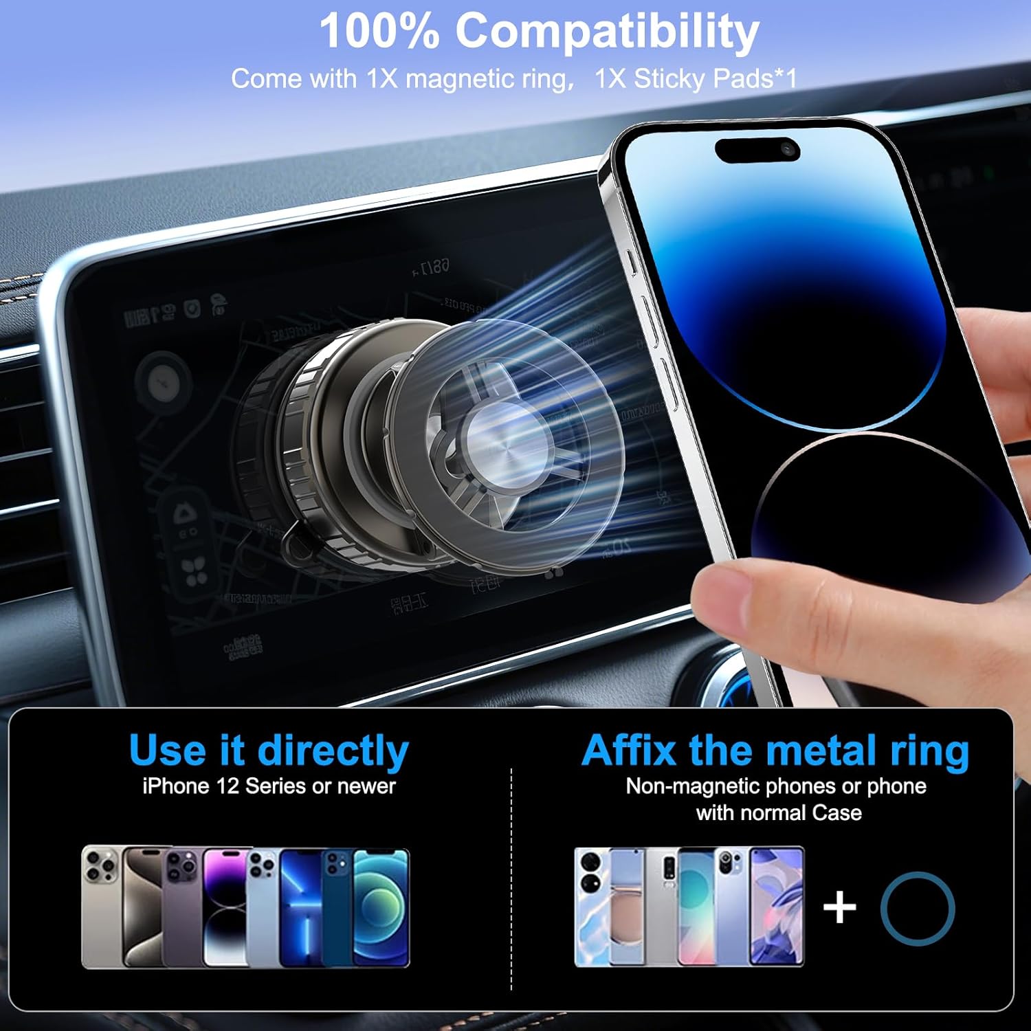 Wide Compatibility-- This phone car mount is designed for iPhone 16/15/14/13/12 series and all MagSafe devices. It comes with a magnetic ring to provide equally strong magnetic attachment for non-MagSafe phones. Whether your phone is naked or in a case, it attaches in seconds with one hand. Exceptional adaptability ensures compatibility with various vehicle models, guaranteeing stable and convenient installation in any car.