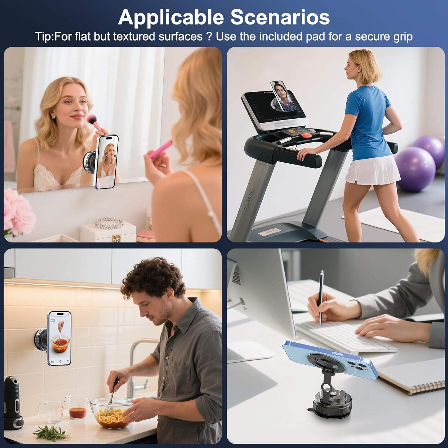 Multi-Scenario Use--More Than Just a Car Phone Holder—Turn Any Smooth Surface Into a Hands-Free Station! Stick it to your kitchen counter to view recipes, place it on your desk for video calls, or attach it to your fitness mirror to demonstrate workout moves. This dual-purpose magnetic phone mount for car and home features a scratch-resistant suction cup that securely adheres to granite, glass, or laminate surfaces. One device holder meets all your mobile needs—from road trips to Zoom meetings.