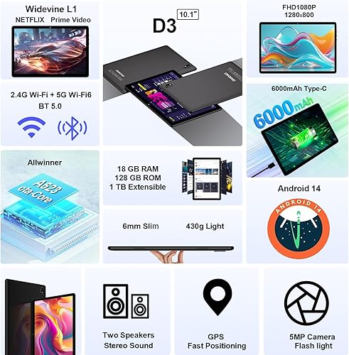 【18GB RAM + 128GB ROM + 1TB Expansion】Android 14 tablet has 4GB RAM, which can be expanded up to 18GB in the settings. Whether you are playing a game or working on a task, the 10.1 tablet delivers a smooth experience. Equipped with 128GB ROM and MicroSD card slot (expandable to 1TB), you can store more of your favorite apps and content. (Not support add SIM card! !!)The 10 inch android tablet has a built-in 6000mAh battery up to 8 hours of usage, perfect for your daily commute, travel, and on-the-go entertainment needs.