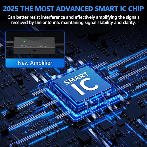 Long Range Signal Reception: 2025 New upgraded TV antenna is equipped with the newest smart IC chip & powerful signal booster, which can not only receive up to 2K+ mile range channels but also optimize signal transmission protection to prevent interference with other signals, ensuring maximum signal strength and reception quality in any environment.