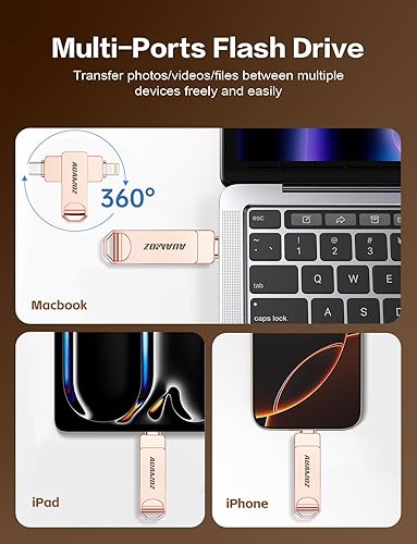 【3 in 1 Multi-Port USB Drive】Our versatile USB drive features separate USB-C, USB-L, and USB ports (Adapter), streamlining data transfer between devices. Say goodbye to cables, iTunes, and iCloud restrictions. Compatible with iPhone 16/15/14/13 series, iPad Air/Pro, Android smartphones (with OTG enabled), and computers. (Note: Requires iOS 13 or higher for iPhone; Android devices must support OTG)