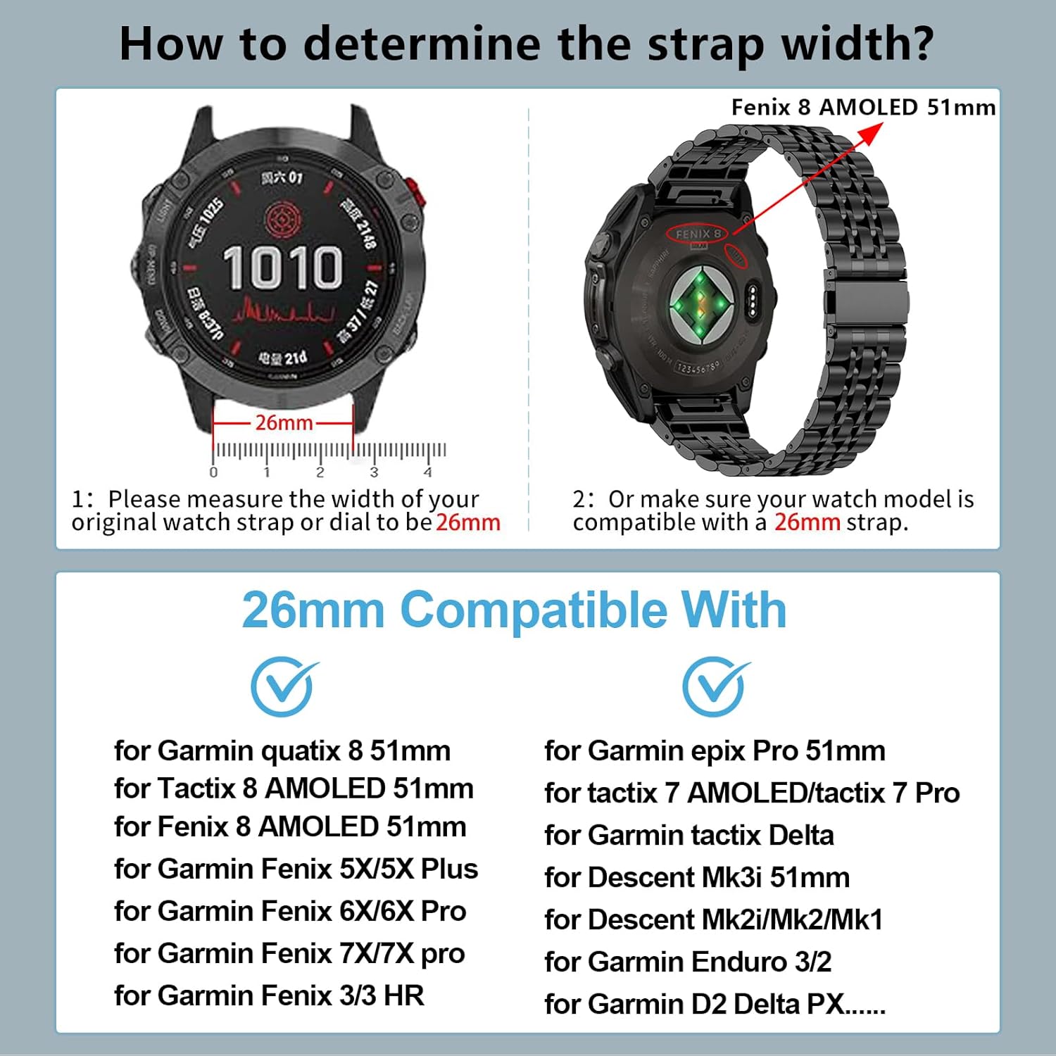 Compatible Models:26mm metal watch bands Compatible With Quatix 8 51mm/Tactix 8 AMOLED 51mm/Fenix8 AMOLED 51mm/Fenix 7X Pro/Fenix 7X/Fenix 6X Pro/Fenix 6X/Fenix 5X/Fenix 5X Plus/Fenix 3/Fenix 3 HR/Enduro3/Enduro 2/Enduro/Mk 3i 51mm/Descent Mk2/Mk 2i/epix Pro 51MM/tactix 7 AMOLED/tactix 7pro/Ttactix Delta/D2 Delta PX,The width of this strap is 26mm.Please measure whether your original strap is 26mm wide before purchasing