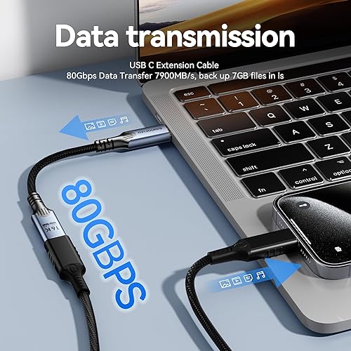 80Gbps Ultra-Speedy Data Transfer: The USB C male to female extension cable, a top-tier usbc extension, leverages USB5 for 80Gbps bidirectional speed (twice USB4). It zips through 8K videos and large files, backward-compatible with USB4/3/2—making this USB c male to female cable a data transfer powerhouse