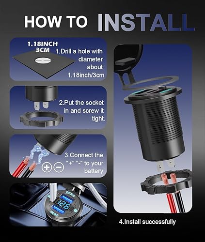 15-Minute DIY Installation - 23.7" wiring harness with silver(+) & gold(-) connectors + 3 fuses (1 installed, 2 spare). No tools needed - connect to battery terminals in 60 seconds. Note: Voltage display activates only with proper polarity connection.