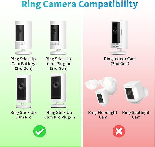 Designed for Ring Camera and others - This accessory kit is compatible with Ring Stick Up Cam, also fit for Eufy, Wyze, Arlo, Simpllisafe Camera and other cameras with standard 1/4 threaded hole. (camera not included).