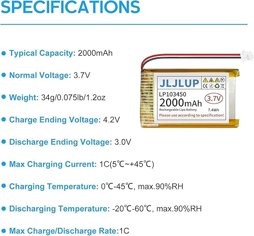Easy Installation with Micro PH2.0 Connector: The 2000mAh lithium polymer battery feature a Micro PH2.0 connector and a wire of about 70mm, making installation simple and convenient. Upgrade your devices effortlessly with our user-friendly design, ensuring a secure connection for maximum performance.(NOTE!!! The maximum operating current of this battery is only about 1.5A, Can Not be used for unmanned vehicles, model aircraft or other products that require high current)