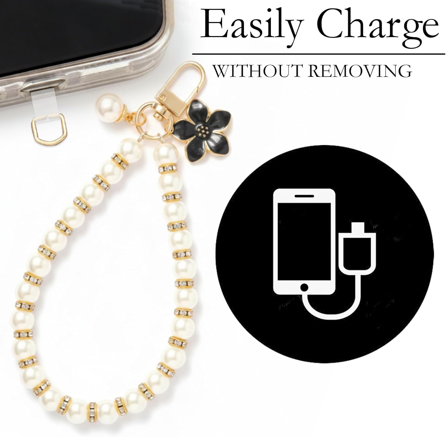 Elegant Design & Shape: This stylish phone charm wrist strap features lustrous pearlsand sparkling crystal-encrusted gold spacers, accented with a detachable ABS floral charm (white/black). Perfect for adding a touch of elegance to your phone while keeping it secure, making it a chic phone charms strap that doubles as a wristlet keychain or a decorative bag charms for effortless elegance.