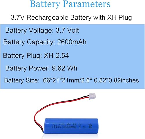 Confirm Battery Specifications: 3.7V 2600mAh Rechargeable Battery with XH 2.54 Connector Lithium ion Replacement Batteries. Capacity: 2600mAh, Power: 9.62Wh; Size: 66 * 21 * 21 mm/ 2.6 * 0.82 * 0.82 inchs; Connecter Plug: XH2.54. Before purchasing, please note that the connector model is the XH connector you need.