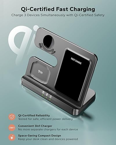 【Safe and Reliable Charging】The wireless charger stand ensures complete safety with multiple protection systems, including overvoltage protection, overcharge protection, shortcircuit protection, overheating protection, FOD, etc. This charging station brings reliable and worry-free charging for all your devices.