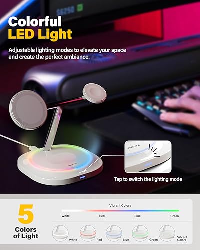 【Reliable & Sleep-friednly Indicators】This wireless charger features 6 kinds of LED color to match any setting. Simply tap the panel to switch colors effortlessly and create the perfect ambiance. When placed your iphone on the charging pad, the yellow LED light turns on and automatically turns off after 10 seconds in charging mode—ensuring it never disturbs your sleep. It is perfect for your office, bedside tables, gaming desk, living room, nightstand, and even as festive decor.
