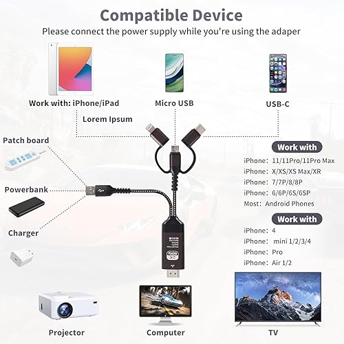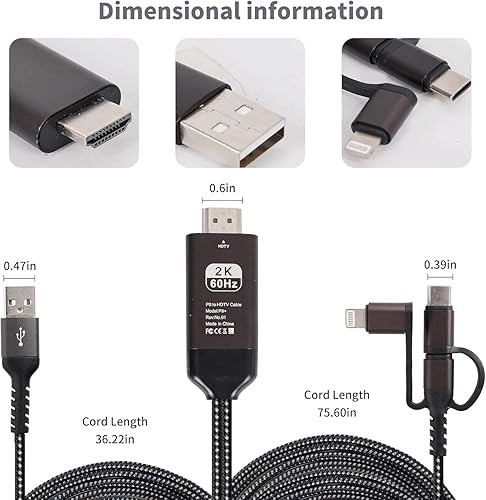 【3-in-1 Universal Design】 ✅ Multi-Interface Compatibility:HDMI Cable -Integrated Lightning+Type-C+Micro USB ports support iPhone 15/14 Series, Samsung Galaxy S24/S23, Huawei P60/Mate 60, and most Android/iOS devices (Android 5.0+/iOS 8+).✅ One Cable, Three Uses:Eliminates the need for multiple adapters—perfect for switching between iPhones, HDMI Cable Samsung phones, and older Micro USB devices (e.g., HTC, LG G6).✅ Cost-Effective Solution:Get 3 adapters in 1 package, saving 50% vs buying separate cables.