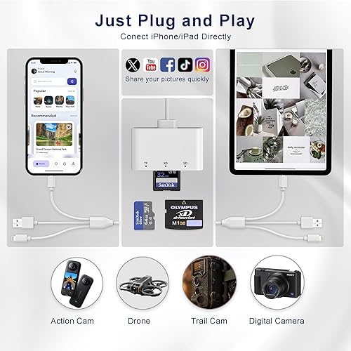 Plug & Play + Durable Design: The SD card reader for the iPhone does not require any applications, drivers, or an internet connection. Simply connect and transfer instantly. Built with reinforced cables and heat-resistant connectors for stable performance and longevity. Compact and lightweight for travel, work, or on-the-go use.