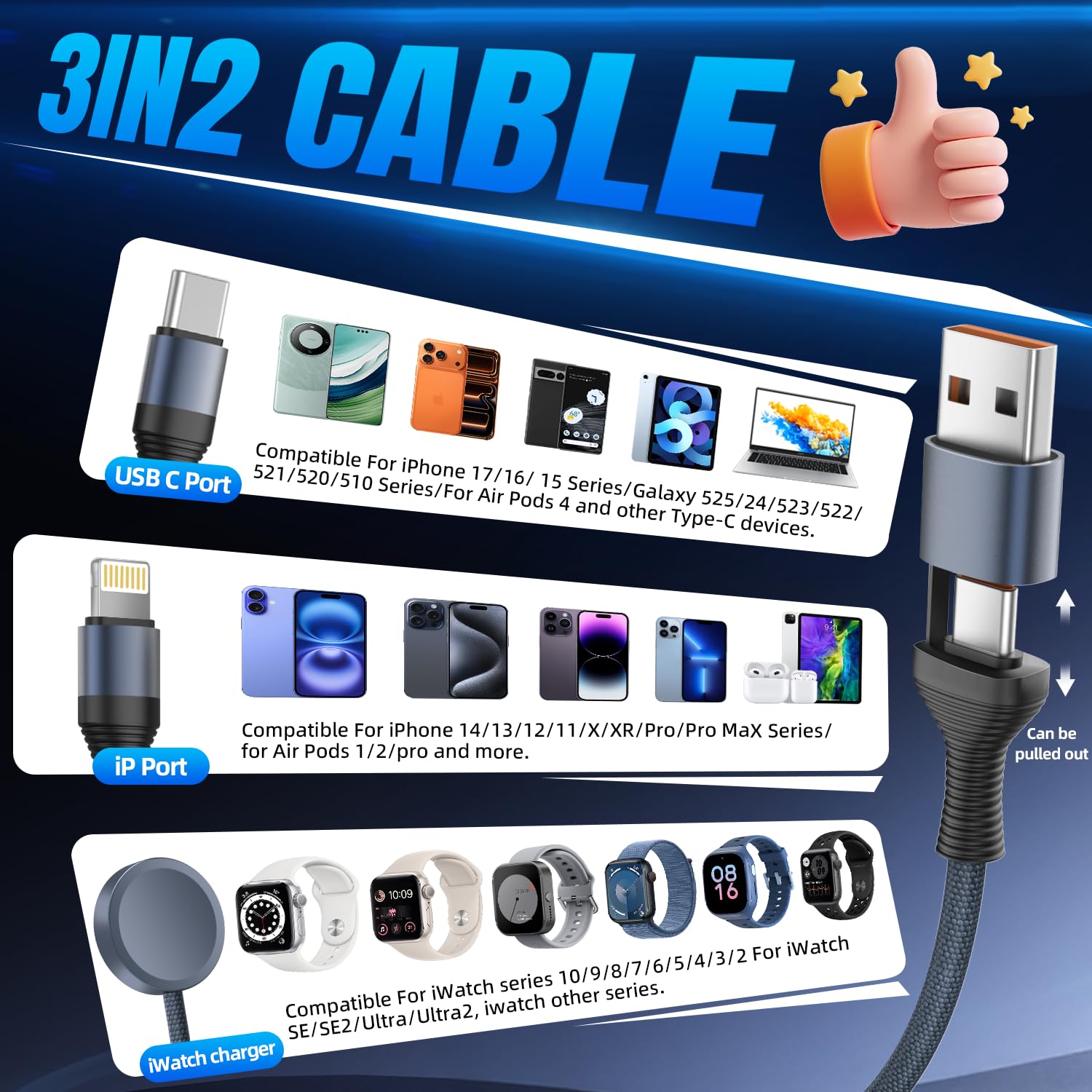 [3 in 2 multi charging cable]:This 3-in-2 multi charging cable combines USB-A and USB-C dual input with triple output options (Lightning, Type-C, and Apple Watch Charger), offers 6 charging options. Multi charger cable compatible with iWatch Series 1-10/SE/Ultra series/iPhone 17/16/15 and newer models, and works with various iPad versions (both Lightning and USB-C). It is a portable iphone watch charger and universal charging cables for multiple devices, designed to charge multiple devices at once. An ideal travel backup charging solution