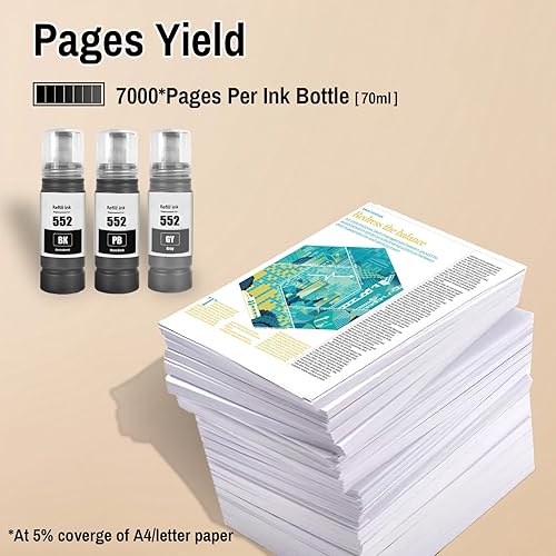 High Yield: Up to 7000 Pages per 552 Black ink bottle, up to 7000 Pages per 552 Color ink bottle. (At 5% coverage A4 paper).