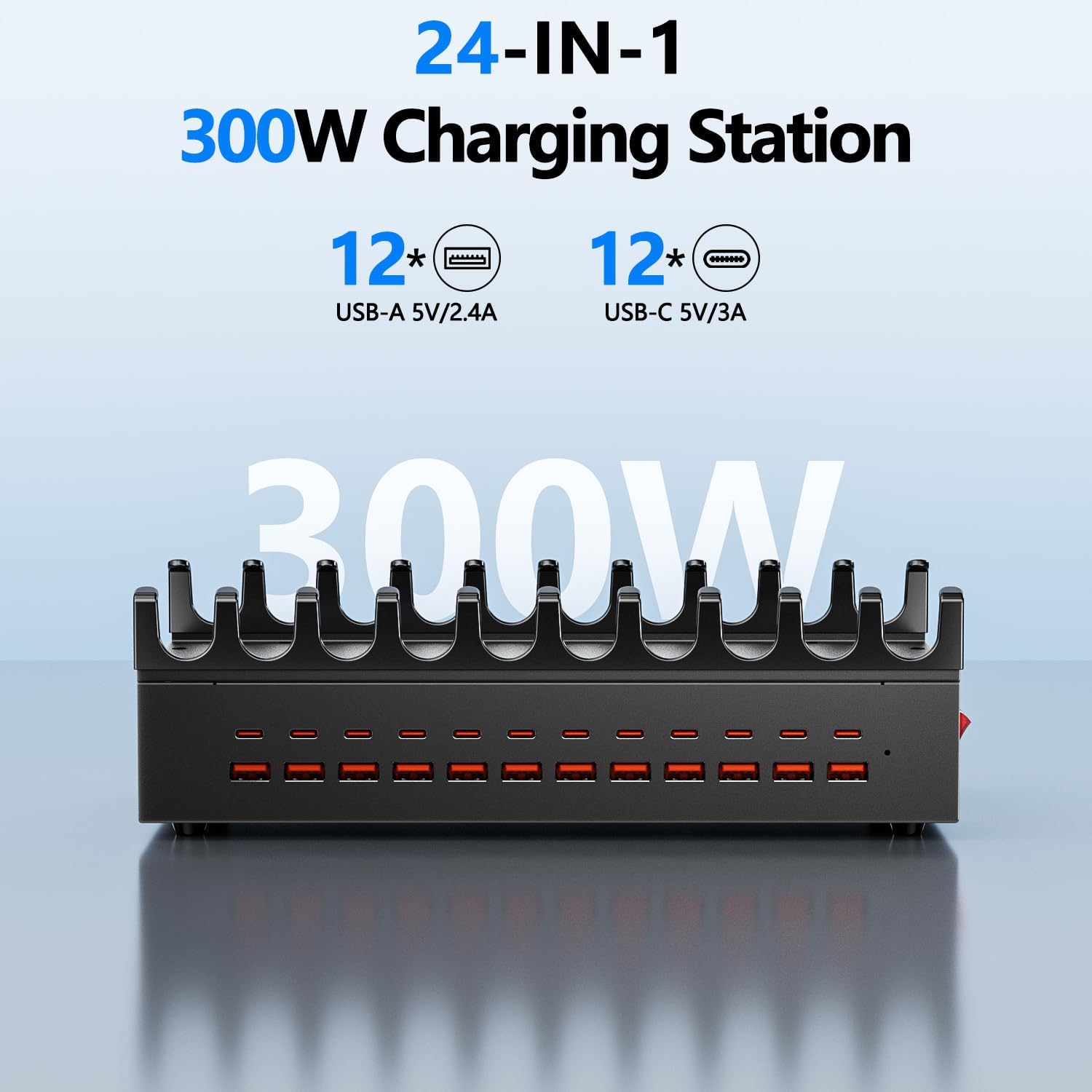 【24 Ports Charging Station】This charging station features 12 USB-A ports and 12 USB-C ports, capable of powering up to 24 devices simultaneously. Eliminate cable clutter and charge all your devices in one place—ideal for homes, offices, or businesses. USB-C ports support up to 5V/3A (15W) and USB-A ports up to 5V/2.4A (12W).Total output power is 300W.