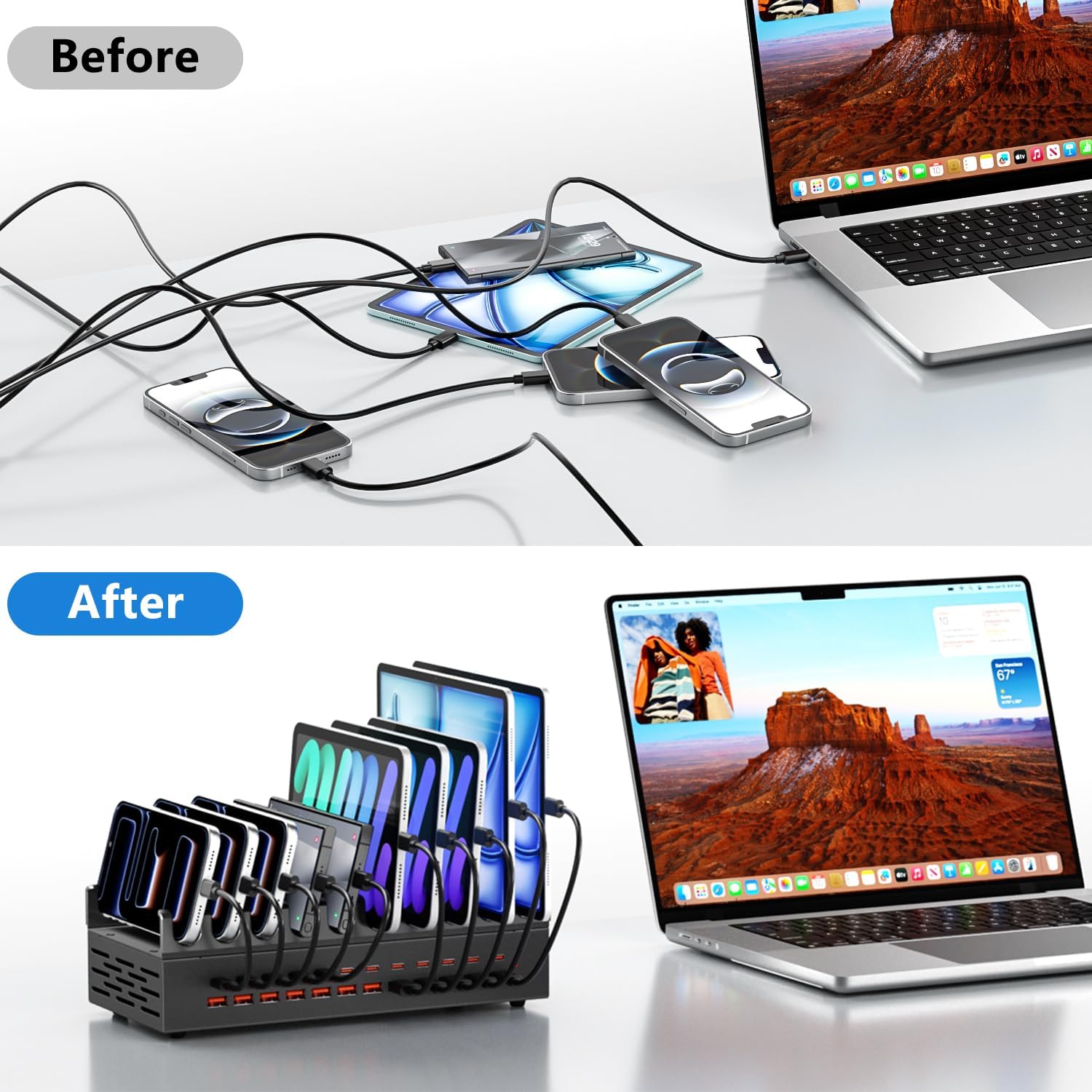 【Sturdy Iron Shell】Our multi-port charging station is made of sturdy iron to ensure a longer service life. We designed the slots wide enough for everyday use with smartphones and tablets, even if they have thick shells. It helps minimize cables on desks, countertops, and nightstands while maintaining an attractive appearance.