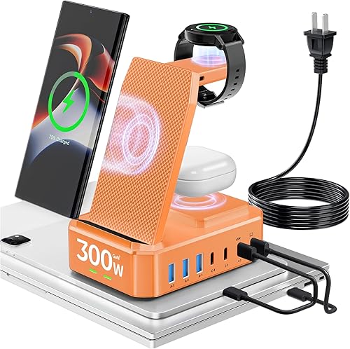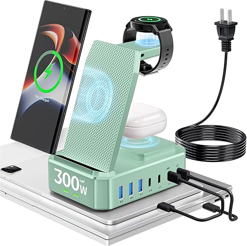【10 in 1 Wireless Charging Station】: This charging station consists of 7-port usb c charging station and 3 in 1 Samsung charging station.The Samsung wireless charger can only work for Samsung family, such as Samsung Phone, Samsung Watch, Samsung Earbuds,Galaxy series.The multi usb charging station works for laptops, iPhone,iPad, AirPods, Android devices, Kindle, Switch and more.Note:Not for Apple Watch .(The USB-C port on the watch wireless charging stand is Non-charging port)