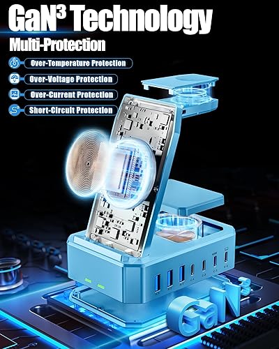 【Safe Charging&Multiple Protection】: Our Dual 65W PD usb c fast charger dock is equipped with the latest intelligent and efficient chipset with GaN III technology to ensure fast and safe powering of your devices. Ready to charge your Macbook series and other laptops. Our phone and watch charging station features over-current, over-voltage, over-temperature and over-charging protection. The internal circuitry is designed to prevent overcharging from damaging your device, ensuring safe charging.