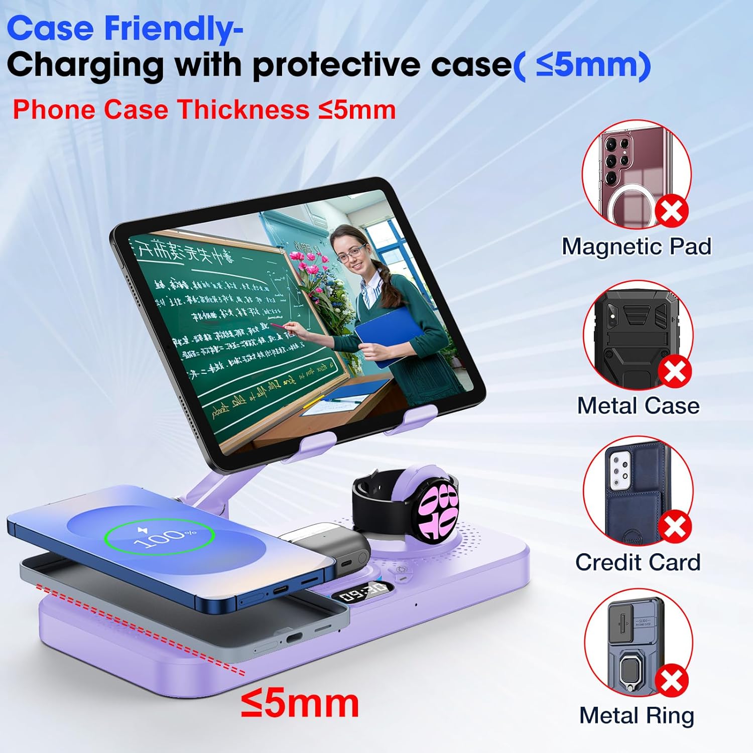 [Safe& Efficient Charging Stand]: 3 in 1 Mage-Safe charging station for samsung is built in temperature control, overcharge protection, over-current and over-voltage protection, and foreign object detection, providing you a safe wireless charging experience. Our charger support phones with a case thickness of less than 0.2 inch (5mm). Incompatible with: [Metal Case/0tterbox Case/Magnetic Ring/Credit Cards/Magnetic/Magsafe Case]