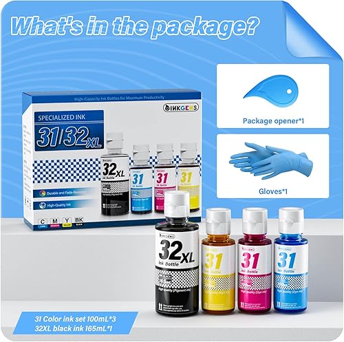 31 32XL ink bottle Set Contents: 32XL black ink bottle 165ml x 2, 31 ink bottle set (cyan, magenta, yellow) 100ml x 6; Gloves x 1 pair and bottle cap opening gadgets x 1.