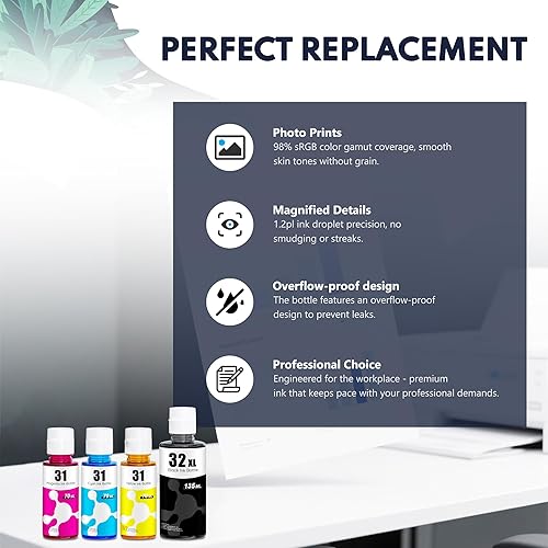 31 32XL Ink Refills: Anti-leak design with auto-stop technology—no squeezing required for mess-free refilling. Compatible with Smart Tank printers. Premium ink ensures vivid colors, quick drying, fade resistance, and smooth, clog-free prints. Perfect for home and office efficiency.