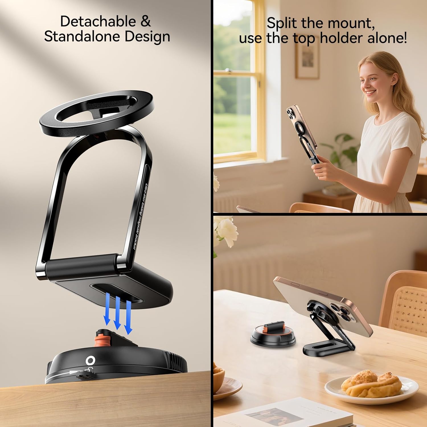 [Detachable Design for Flexibility] With an innovative detachable structure, this phone holder splits easily: use the main part as a phone stand for desk at home, or detach it for a portable handheld mount (great for on-the-go recording or following kitchen recipes). Adds extra versatility to your car phone holder setup.