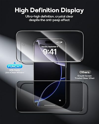 [360° privacy screen protector]FUNCAT Privacy Screen Protector iPhone 14 Pro utilizes advanced anti-peep technology and a unique blind design to provide an industry-leading 25° ultra-narrow viewing angle. No matter where you are, the content of your screen is visible only to you. Unlike other phone films that blur the screen, our ultra-clear coating delivers sharp image quality for a more comfortable and enjoyable viewing experience!