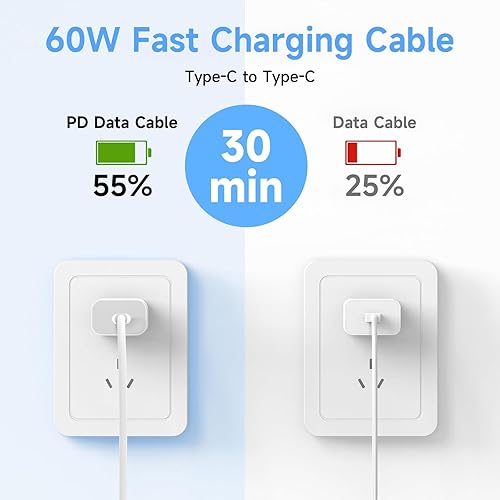 【60W USB-C to USB-C Fast Charging Cable】With PD 3.0 support, this cable enables rapid charging—powering your device up to 80% in just 30 minutes when paired with a compatible adapter (20W/60W). It also supports 480Mbps data transfer for seamless syncing.