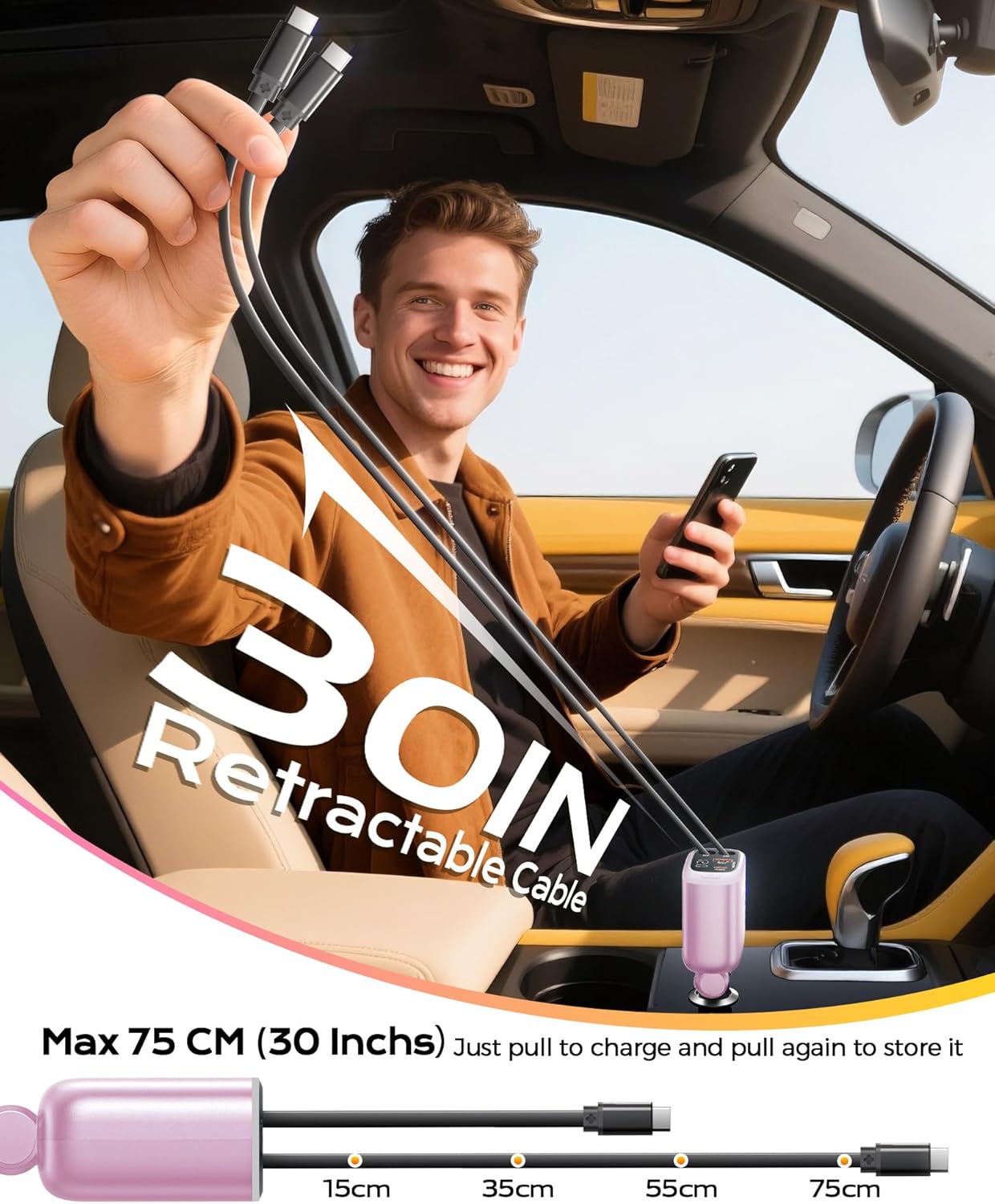 【Retractable Car Charger Fast Charging, Say Goodbye to Waiting】The iPhone 16 car charger supports PD + QC 3.0 dual fast charging protocols, 30 minutes for the iPhone 16 can be charged into 55% of the power, 80% faster than ordinary chargers.