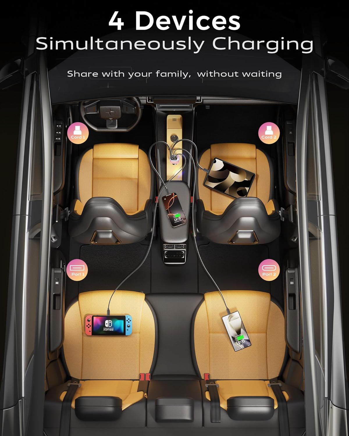 【4 in 1 Car Charger Travel Essentials, One Device for All】This retractable phone charger for car has built-in retractable Type-C/Lightning cable (two retractable cables) + USB charging port (USB A + USB C) to meet the Apple/Android full range of devices. Intelligent shunt without degradation. Passenger and rear passengers can charge their phones, tablets and headphones at the same time, no need to fight for the charging port for self-driving/family trips, and the power needs of multiple people can be easily met. Hidden retractable design, say goodbye to messy wires, make the car space more tidy.