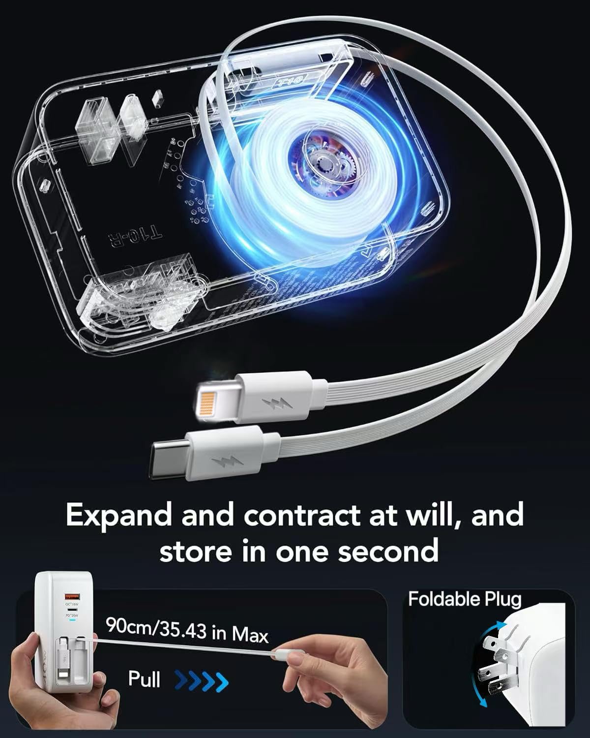 [Dual 90cm Retractable Charging Cables]:This retractable wall charger with dual cables comes with two 90CM retractable cables-1*Lightning and 1*Type-C.The retractable function allows for easy organization and portability,preventing cable clutter.With a maximum retractable length of 90CM (35.5 inches), the cables can retract with just a gentle 1cm pull.You can adjust the length to your preference for charging devices like iPhone 17/16/iPad, making it a must-have for home, office, and travel.