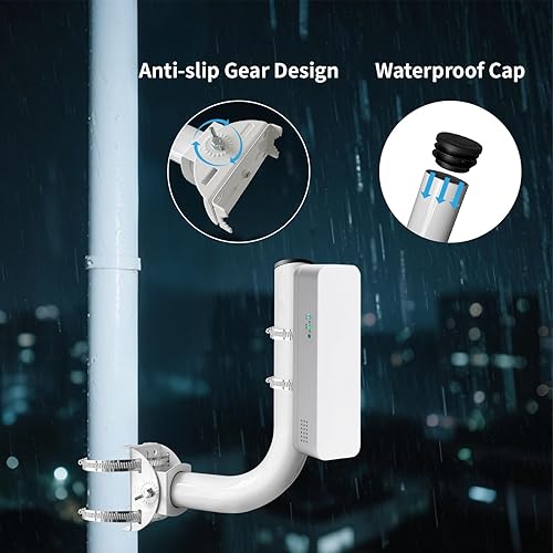 Firmness:This mount bracket is made from cold rolled steel with a glossy white, which makes this bracket mount a good waterproof and corrosion resistant performance.This Wireless bridge pole mount features anti-slip sawtooth grips and concave grooves to prevent pole swaying. This pole mount is equipped with 2 hoops to firmly fix the mount on the rod