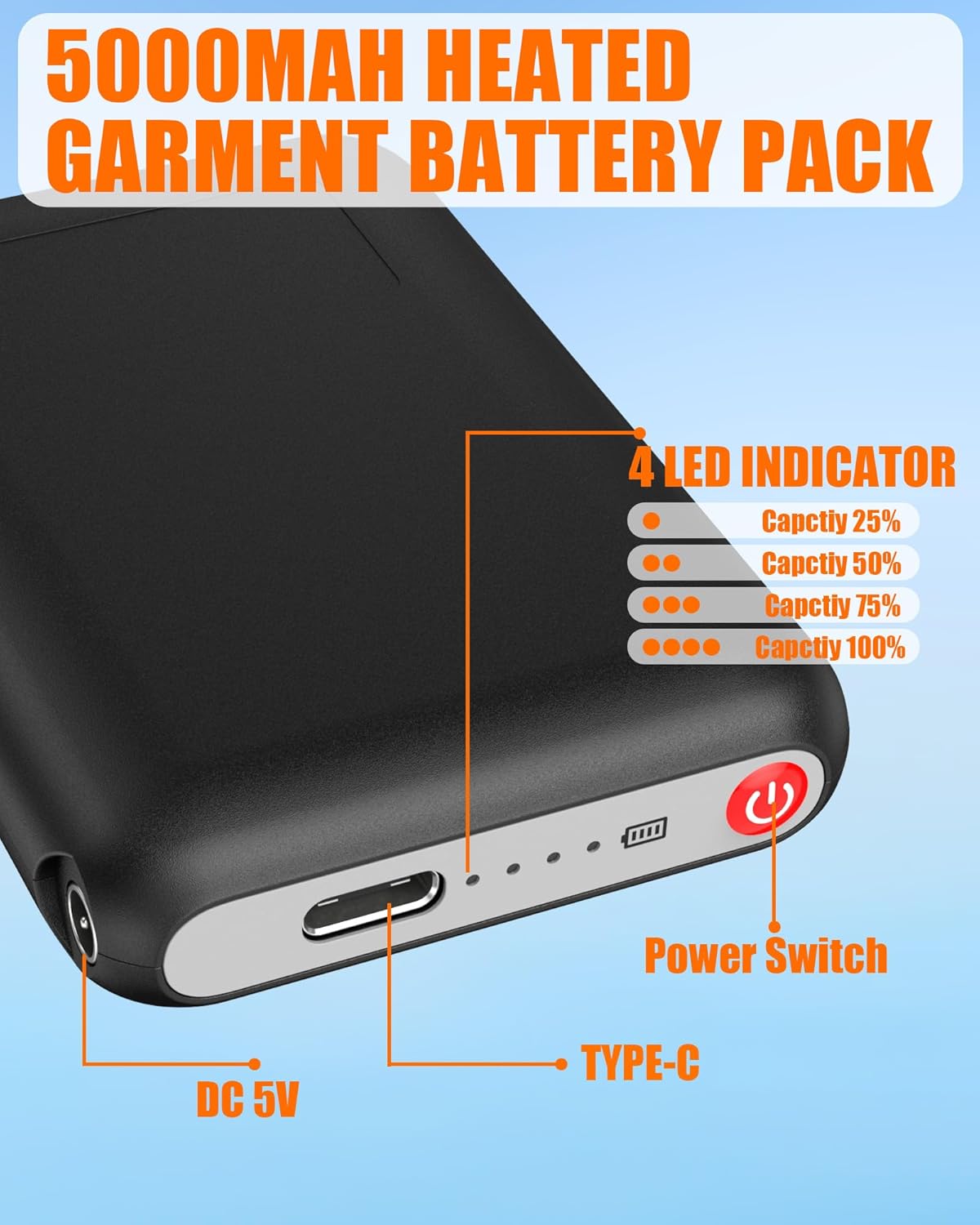 【4000mAh CAPACITY BATTERY】 This power bank boasts a 4000mAh capacity, providing up to 6 hours of heating time for your daily needs. Enjoy 2-6 hours of heat (High 130°F/2 hours) - (Medium 120°F/4 hours) - (Low 115°F/6 hours). It can also serve as an additional battery pack, allowing you to extend your outdoor activities while staying warm.