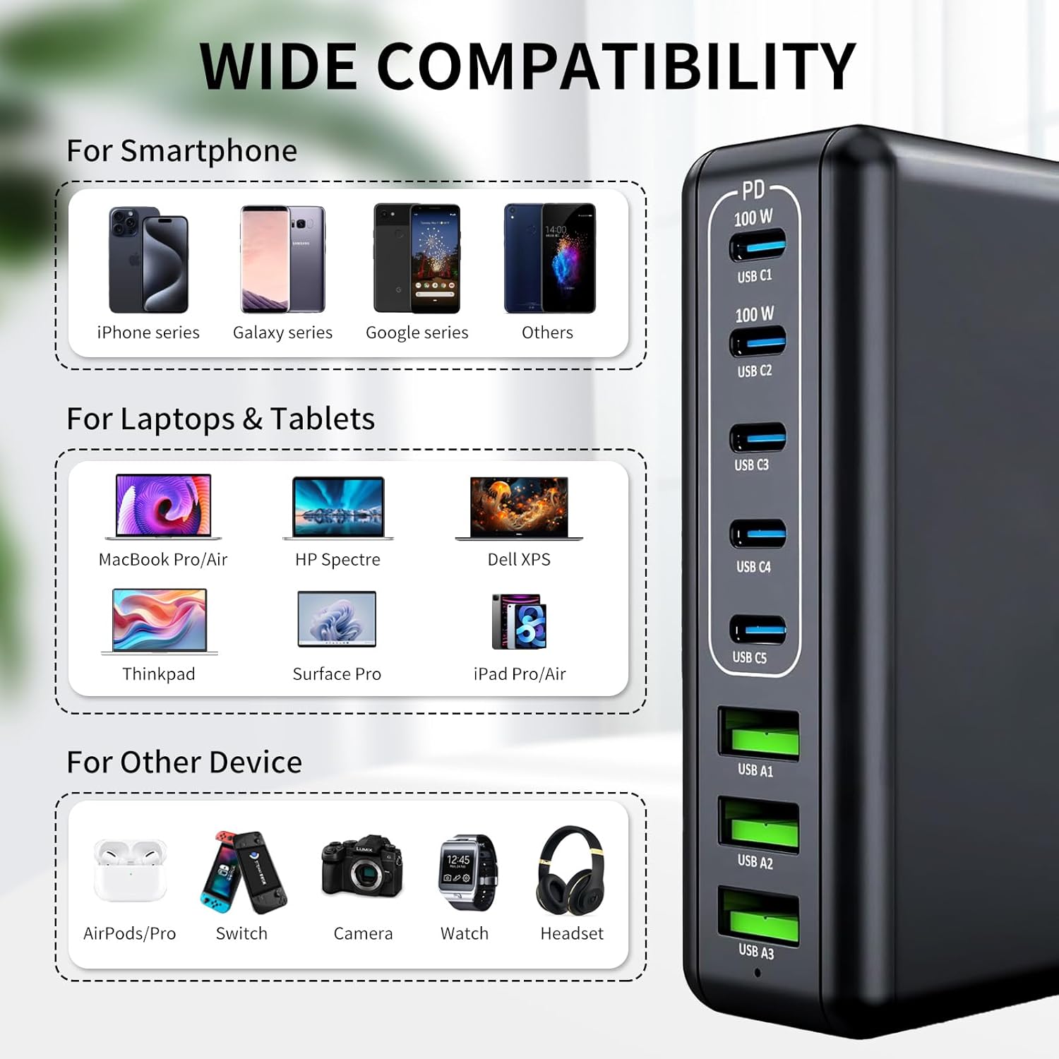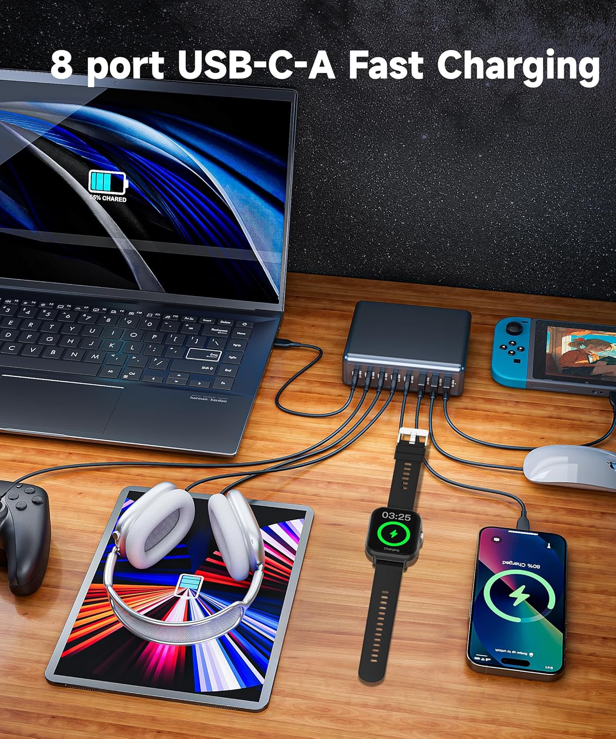 ⚡【8 Port USB C Charging Station with iWatch charger】Our usb c charger block provides 8 charging wattage options with 5*USB-C ports and 3*USB-A ports,no need for more adapters. The usb c charging stations feature 8 independent output ports, ensuring all devices can charge simultaneously at full speed without power sharing and disconnection