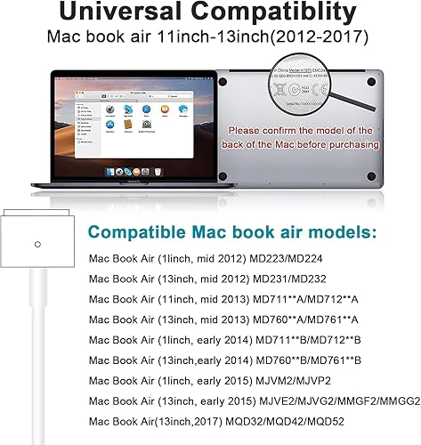 【Universal Mac Charger】: AC 100-240V 50-60Hz, Output: 14.85V 3.05A 45W. Knowing what specific Mac model you have is important.Please check out carefully Before Purchasing