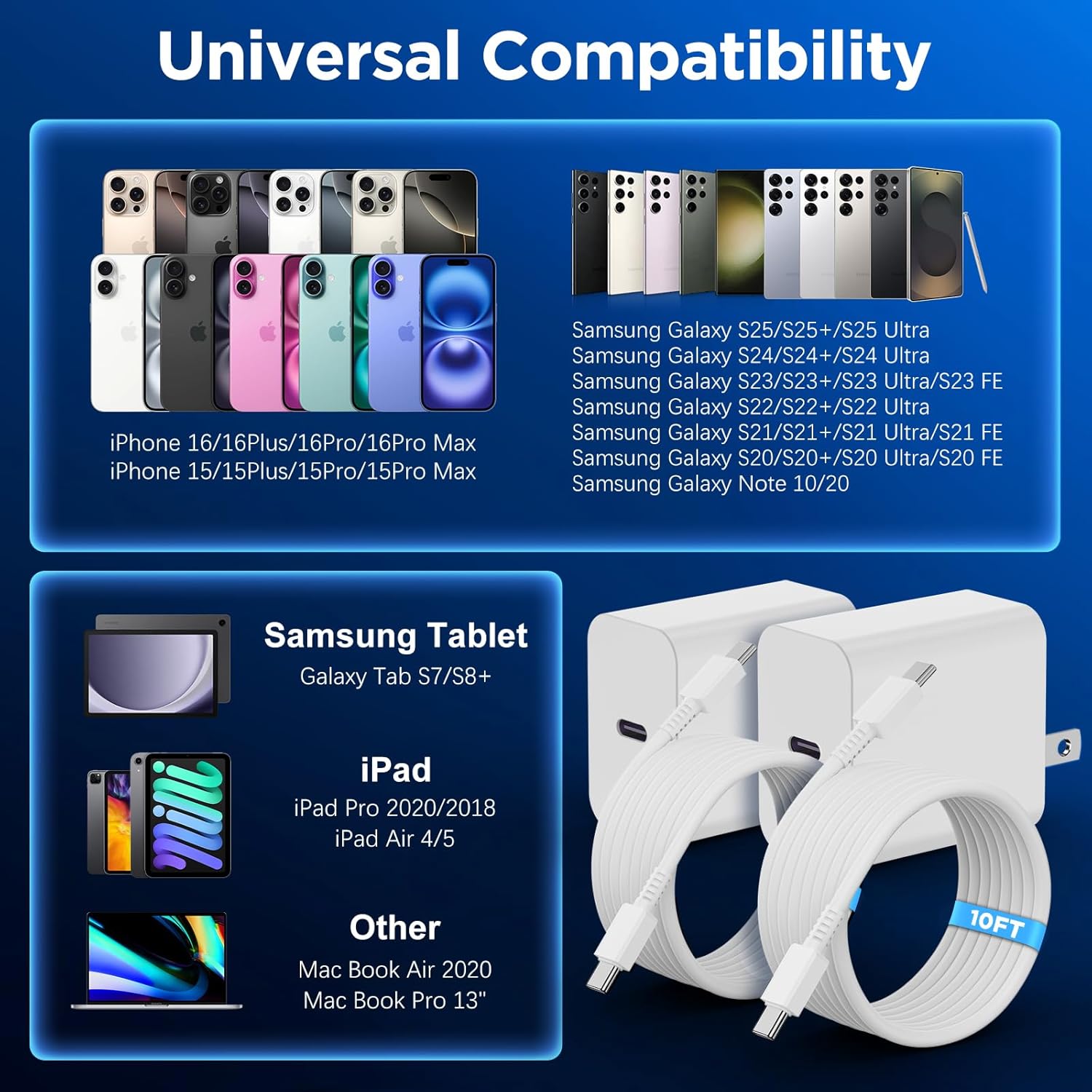 【Wide Compatibility】45W charger with USB-C to C cable supports fast charging for iPhone 17/16e/16 Plus/16 Pro/16 Pro Max, iPhone 15/15 Plus/15 Pro/15 Pro Max, iPad Pro 12.9 inch, iPad Pro 11 inch, iPad Air 5/4th generation, iPad 10th generation, iPad Mini 6, AirPods Pro, Samsung Galaxy S25/S24, and more