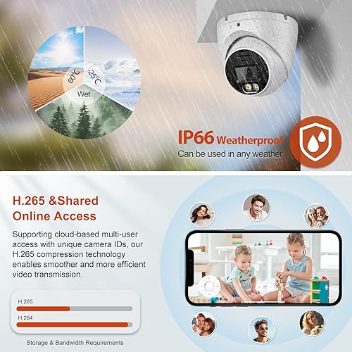 【IP66+H.265 Coding+MicroSD Card Slot】Camera has IP66 waterproof rating,providing robust protection against dust and heavy rain,making it ideal for both indoor and outdoor use. Additionally,it incorporates advanced H.265 video coding technology,which significantly improves compression efficiency compared to traditional H.264.Supports storage to a MicroSD Card (up to 512GB,not include)for 24/7 Recording.