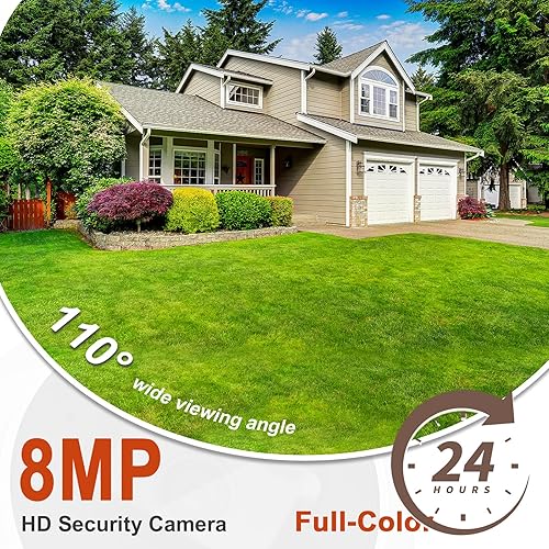 【8MP UltraHD + 2.8MM 110°Wide Angle Lens】This security camera has a 8MP(3840*2160p) HD resolution,delivering exceptionally clear and detailed images.It features a 1/2.8" CMOS sensor, which captures more light compared to traditional 1/3" sensors,ensuring superior performance in low-light conditions and producing brighter,sharper footage.Equipped with a 2.8mm fixed lens,it provides a 110°super wide viewing angle,offering extensive coverage for enhanced monitoring of large area.