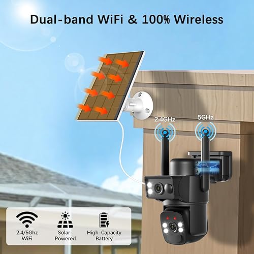 Dual Band WiFi & Solar/Battery Powered: Powered by solar energy and equipped with a large capacity battery, seamlessly switching power in rainy and cloudy weather, avoiding frequent removal of the camera for charging, and providing uninterrupted monitoring for 365 days. Supports 2.4GHz (wider signal range) and 5GHz (faster transmission speed) WiFi. The cameras for home security will automatically select the strongest signal network to ensure uninterrupted real-time streaming and fast alert notifications.