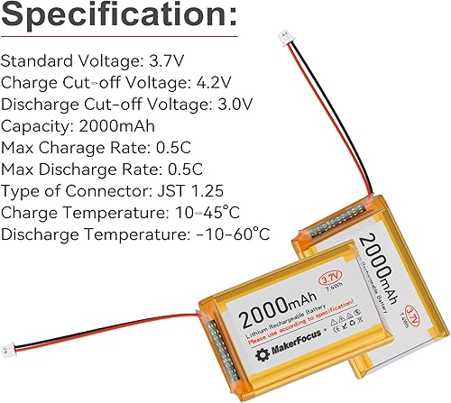 Widely Application: With JST 1.25 plug, these 2000mAh LiPo battery can be used for ESP32 development board whose plug is SH1.25-2, Mesh Node T114 and other low-power IoT/DIY electronics requiring compact power solutions