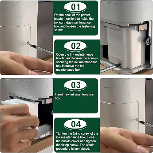 What's in the box: Replacement Maintenance Tank (Ink Pad Sponge Included) * 4, screwdriver * 1, Seal bag * 1, instruction sheet * 1, disposable gloves * 2, Everything you need to replace the maintenance box is in the box, easy to do.