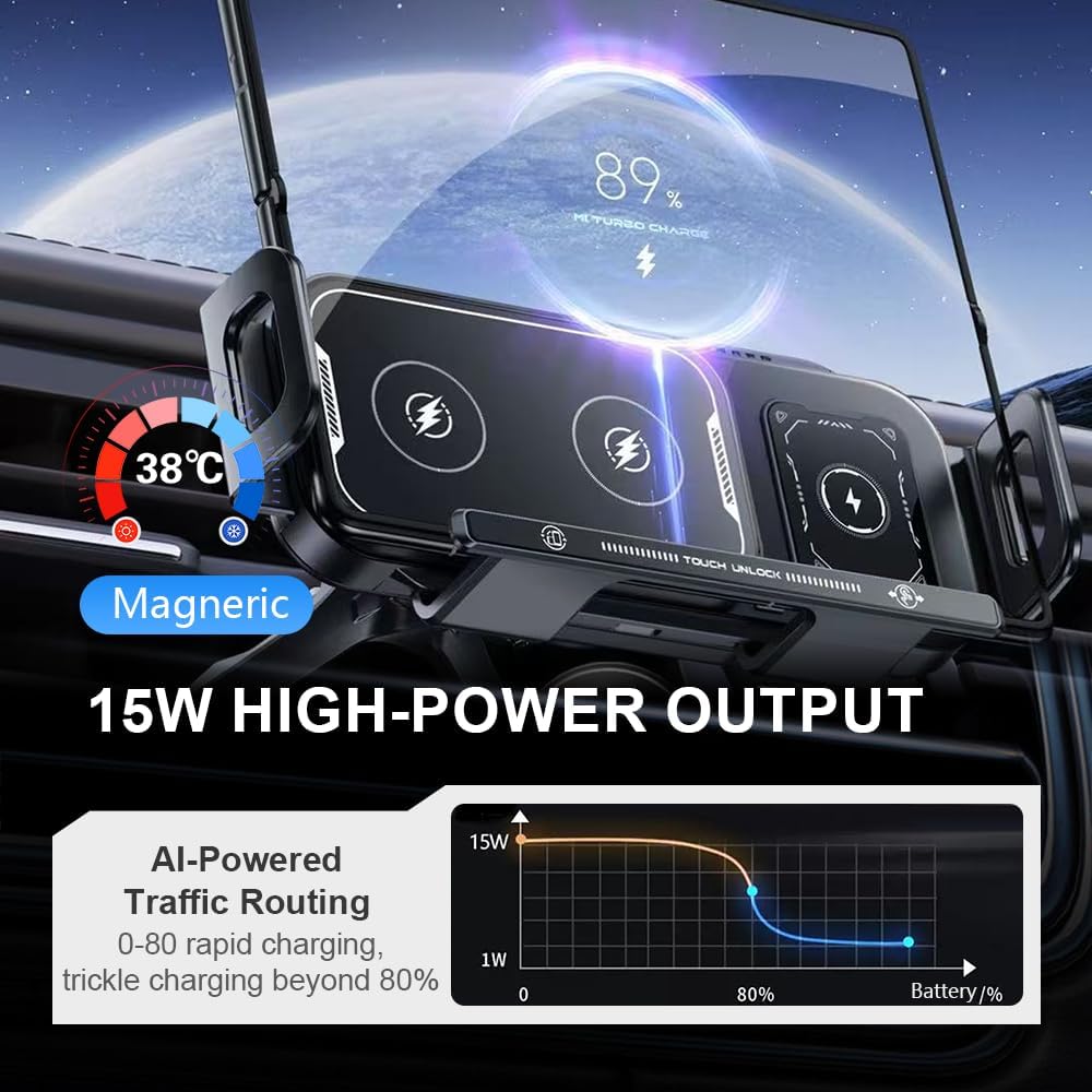 【15W Fast Wireless Charging】Delivering up to 15W wireless fast charging, this black mobile phone mount features advanced dual-coil technology.