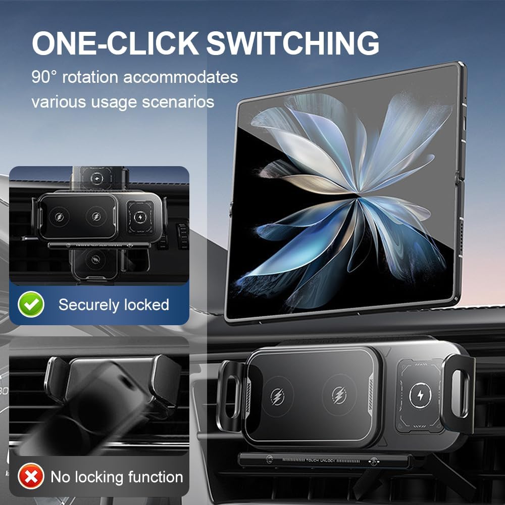 【2 in 1 Wireless Charging Car Mount】It firmly supports the phone while allowing for quick charging; whether you are on a trip or on your way home from work, your phone is fully charged during navigation