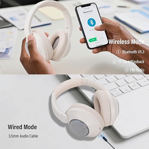 NEVER POWER OFF & DUAL MODE: These wireless headset with a built-in 800mAh battery can play continuously for up to 48 hours after just 2 hours of full charging. The bluetooth headphones over the ear come with a 3.5mm audio jack, allowing you to switch to wired mode anytime for enhanced sound quality. In wired mode, your over-ear headphones will never run out of power