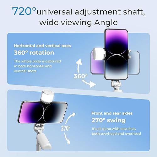 [Upgraded Stability & Anti-Shake]--This tripod selfie stick is made of aluminum alloy and is very sturdy. Simply pull the spring-loaded clamp to secure devices (fits 2.1"-3.9" phones), while the side tension lock ensures zero drooping during shooting. The mobile phone holder adopts a 360° rotating phone clamp combined with a 270° ball-head gimbal, providing precise angle control.