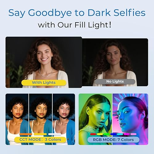 [7RGB &3CCT light senses illuminate your beauty]--The light offers 7 vibrant RGB hues + 3 adjustable CCT whites (2500K-6500K). Adjust brightness via the intuitive back-panel controls for natural skin-tones in any environment – ideal for low-light selfies or professional content creation. The selfie stick tripod with fill light can give you the best natural beauty.